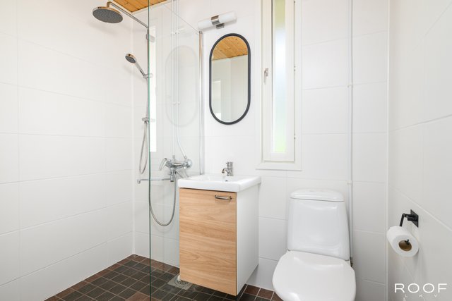 - WC-istuin, suihku, suihkuseinä, pesukoneliitäntä, peili, pesuallas, ja allaskaappi