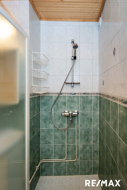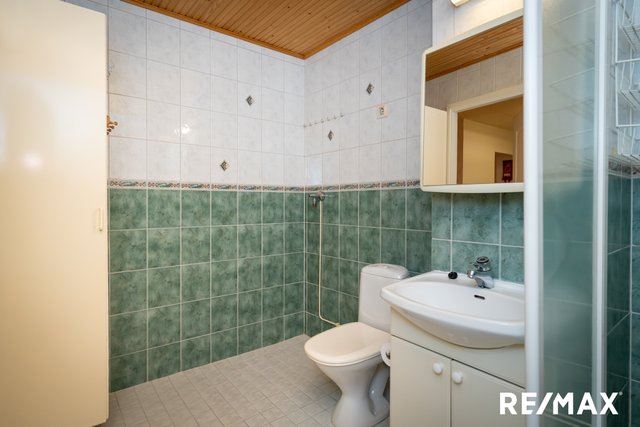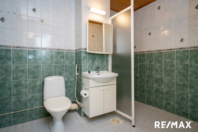 - WC-istuin, suihku, suihkuseinä, pesukoneliitäntä, peilikaappi, pesuallas, allaskaappi, ja pyykkikaappi