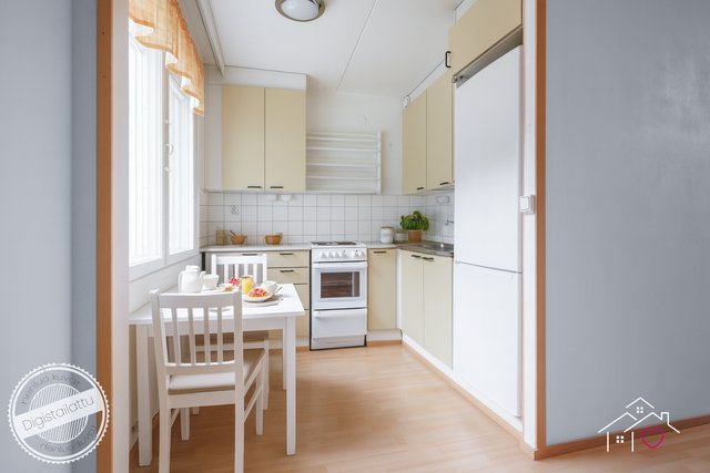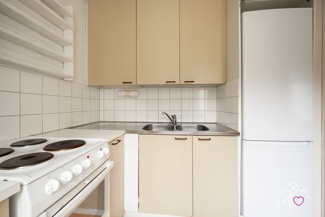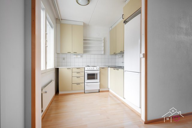 - Keittiössä on alkuperäiset kaapistot, Matsuin jääkaappi/pakastin, Helkaman sähköliesi, 2 allasta, hana ja tasot ja maustehylly. Lattia on laminaattia ja seinät on maalattu. Välitila on laatoitettu.