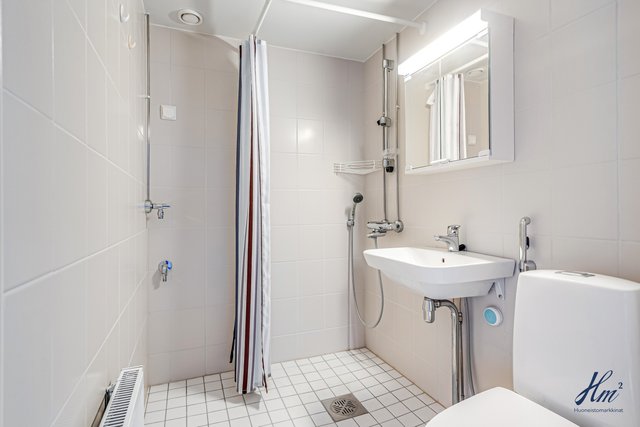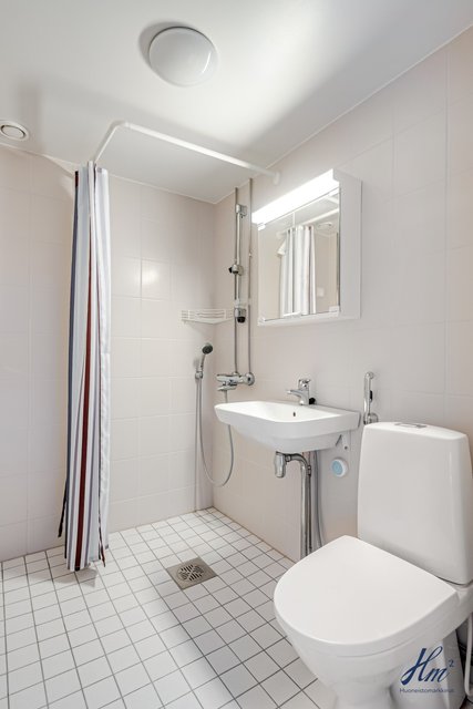- WC-istuin, suihku, bidee-suihku, peilikaappi, pesuallas, ja pesukoneliitäntä