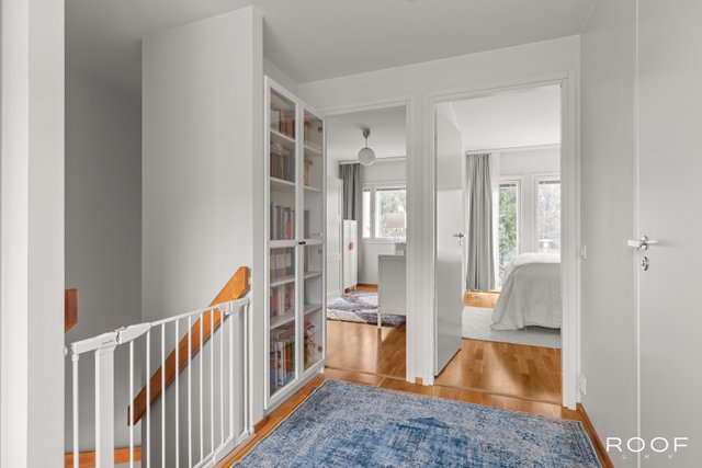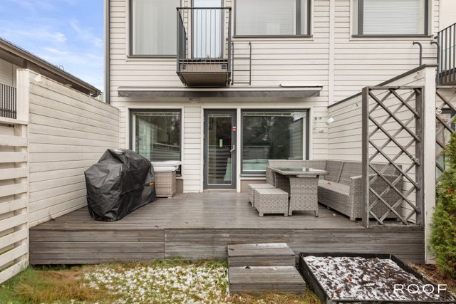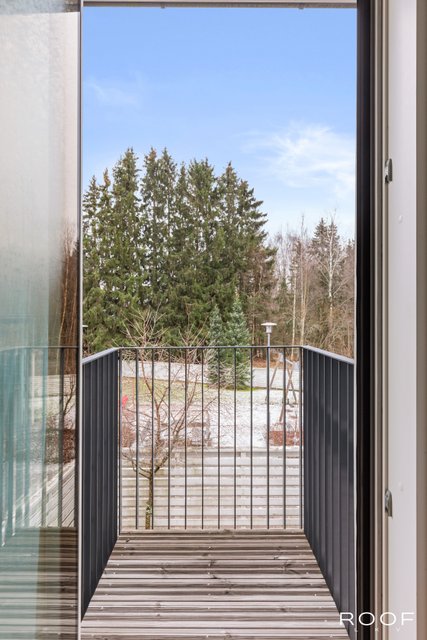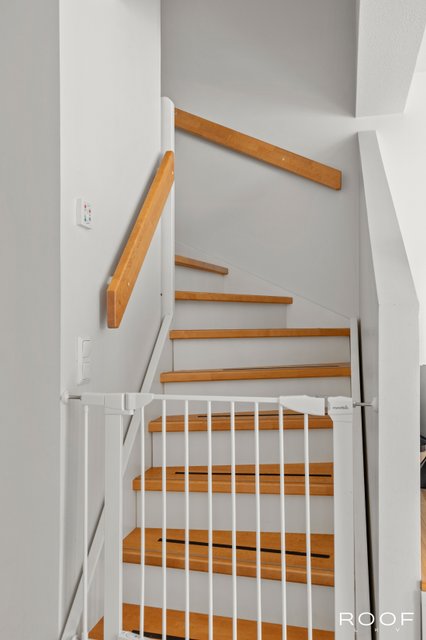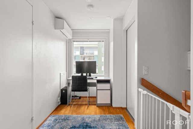 Sisääntulokerroksessa sijaitsee erillinen wc, keittiö sekä olohuone, josta käynti aidatulle piha-alueelle. Yläkerran aulaan mahtuu loistavasti työpiste, lisäksi yläkerrassa on näppärä kodihoitotila, pesuhuone ja ikkunallinen sauna sekä kaksi makuuhuonetta kaapistoineen, päämakuuhuoneessa on ranskalainen parveke.