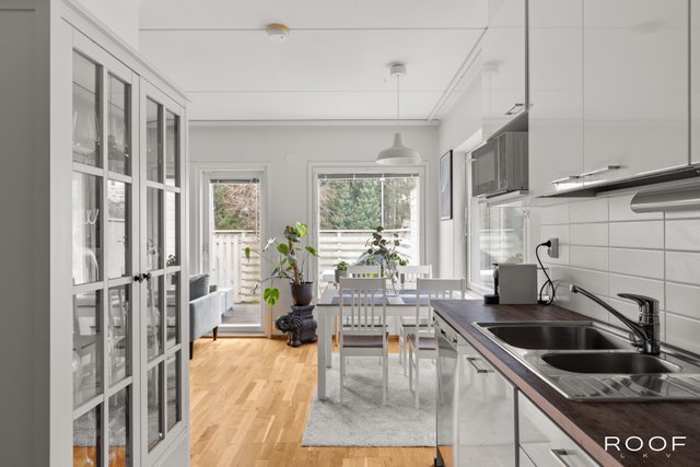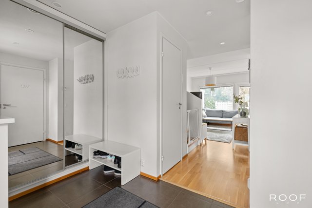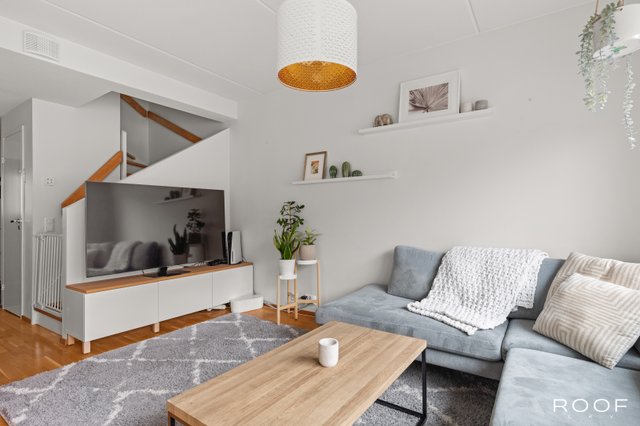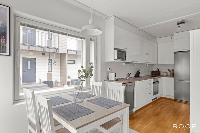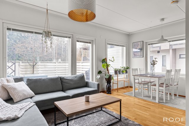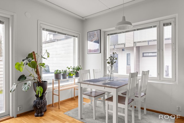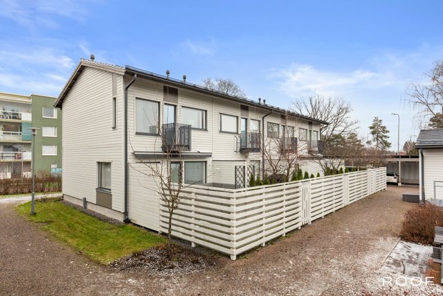 Loistavien kulkuyhteyksien lähituntumassa oleva rivitalokolmio, joka on kahdessa tasossa ja lämpenee kaukolämmöllä. Rv. 2014. Avarassa eteistilassa on liukuovikaapisto ja helppohoitoinen laattalattia. Portaiden alla mukavasti lisäsäilytystilaa. Ulkovarasto sijaitsee heti pääoven vieressä.