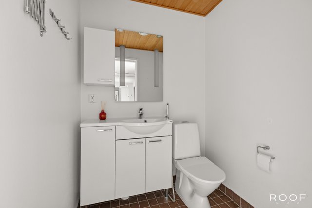- Lattia laattaa, seinät maalattu. Wc-istuin, valopeili, pesuallas, allaskaapisto ja seinäkaappi. Mukavuuslattialämmitys.