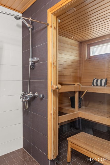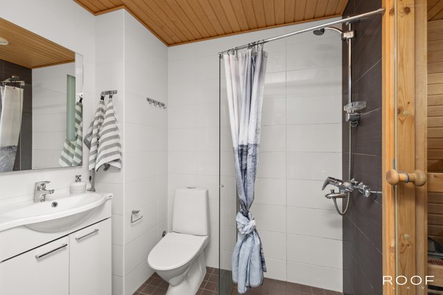 - Suihku, suihkuseinä, valopeili, pesuallas, wc-istuin, allaskaappi, seinäkaappi, bideesuihku. Seinät ja lattia laattaa. Mukavuuslattialämmitys.