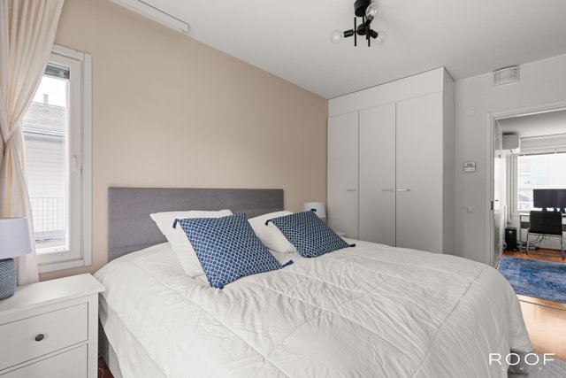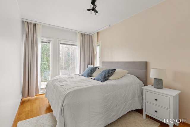 - Kaapistot, seinät maalattu, lattia tammilautaparkettia, päämakuuhuoneesta käynti ranskalaiselle parvekkeelle.