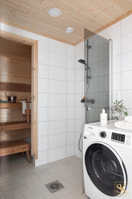 - VARUSTUS: Sähkökiuas. SEINÄT: Puupaneeli. LATTIA: Laatta.