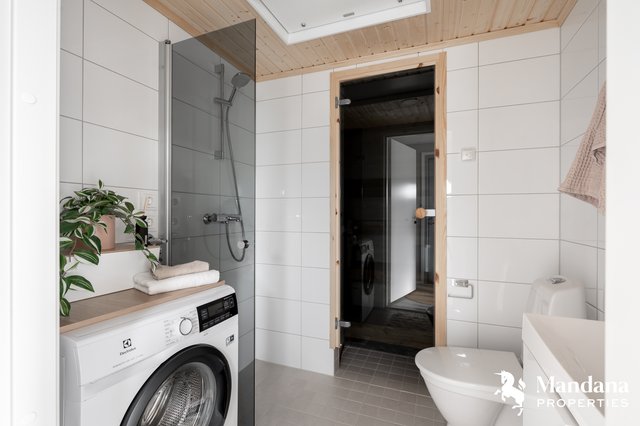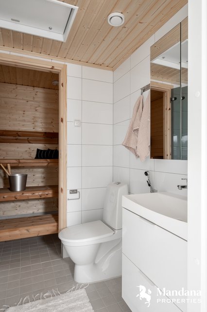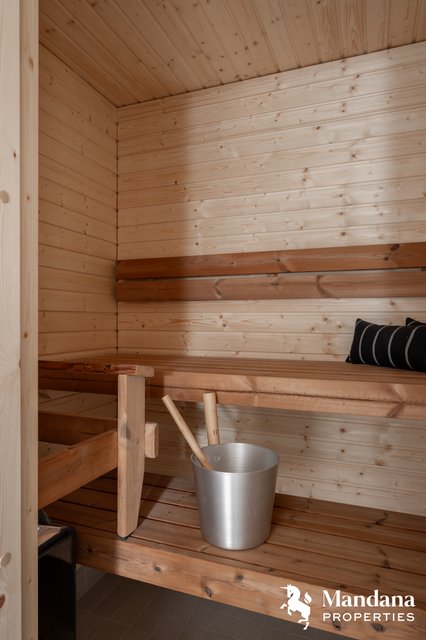 - VARUSTUS: Sähkökiuas. SEINÄT: Puupanelointi. LATTIA: Laatta.