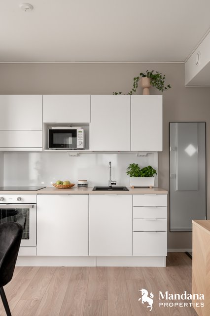 - VARUSTUS: Integroitu jääkaappipakastin, integroitu astianpesukone, erillisuuni, induktioliesi, liesituuletin, pesuallas, hana, kaapistot, ikkunassa sälekaihdin. SEINÄT: Maali. VÄLITILA: Lasi. TYÖTASO: Laminaatti. LATTIA: Laminaatti.