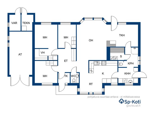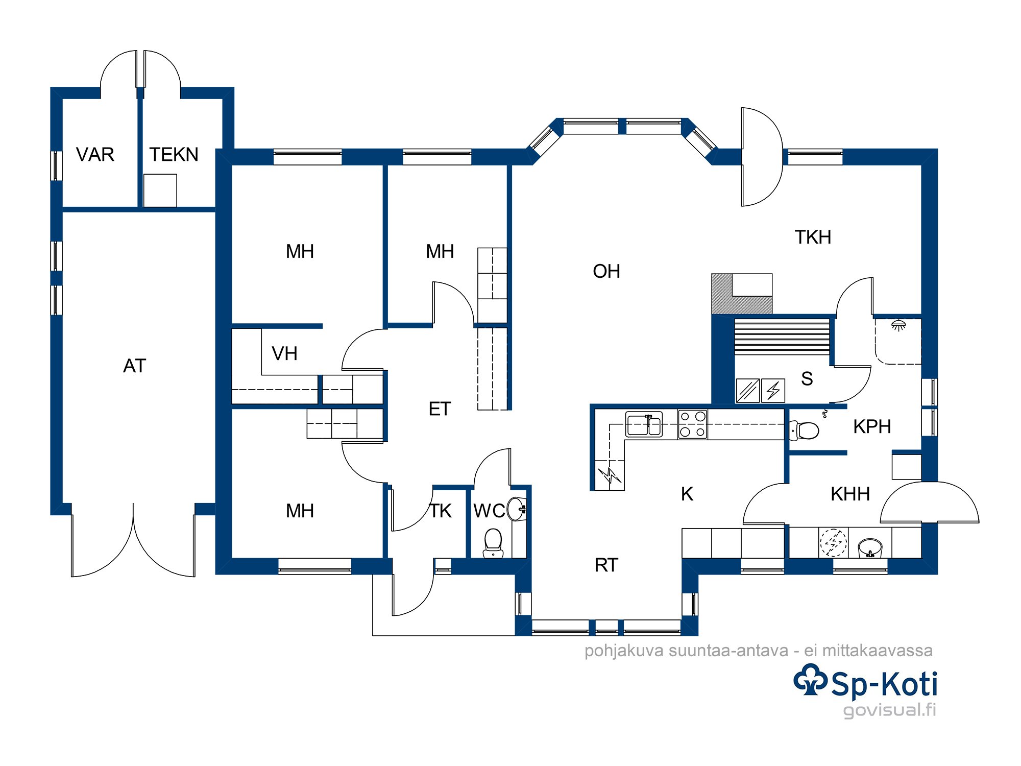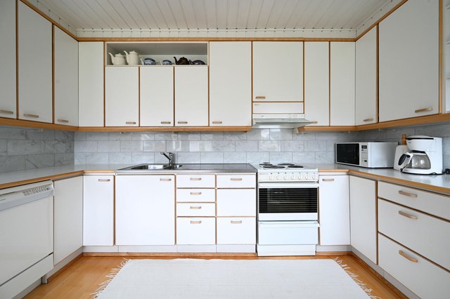 - Keittiö etelänpuoleisella sivulla, keittiöstä näkymät kotikujalle. Keittiö läpikuljettava kodinhoitohuoneeseen.