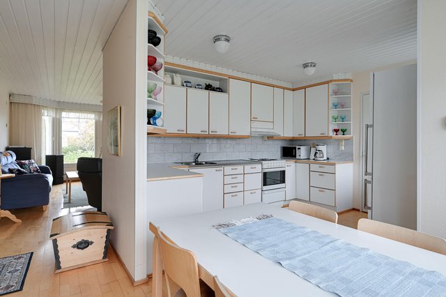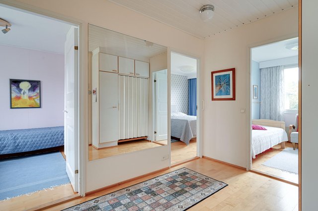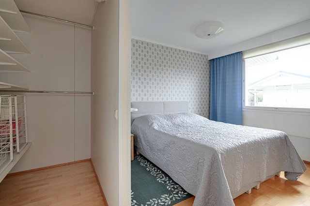 Makuuhuoneet ovat toisessa päässä taloa, joten pienimpien nukkuminen ei häiriinny iltauutisten äänistä. Keittiöön mahtuu hyvin ruokapöytä, laskutasoja riittää ja sieltä on toinen kulku kodinhoitotiloihin. Kodinhoitohuoneessa on erillinen sisäänkäynti. Oven vieressä on kuraeteinen, joka helpottaa pienten jalkojen ja isojen tassujen puhdistusta ulkoilun jälkeen. Lämmin autotalli on hyvä lisätila moneen käyttöön.