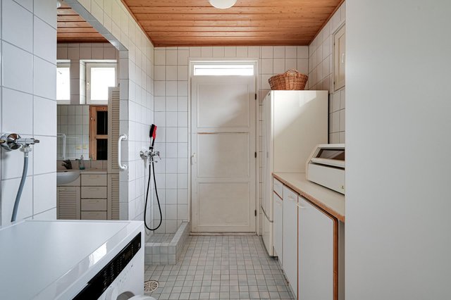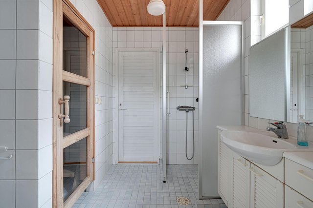 - Pesutilat ja sauna rakennuksen itäpäädyssä. Pesutiloihin kulku kodinhoitohuoneen ja takkahuoneen kautta. Kuntotarkastuksen mukaan pesutilan lattian ja seinien mahdolliset vedeneristeet/kosteussulut ovat teknisen käyttöikänsä päässä.
