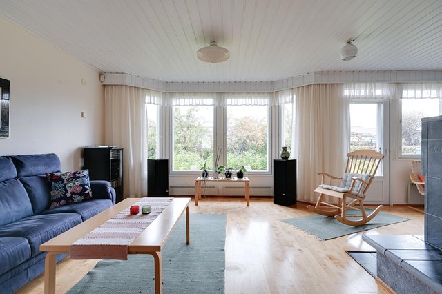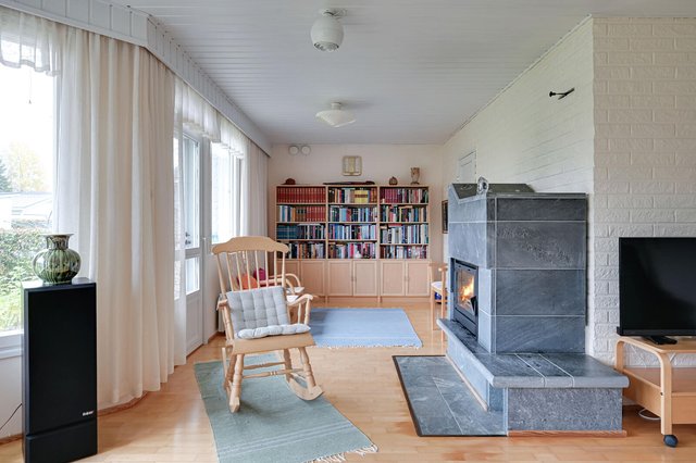 - Valoisa ja avara olohuone on sisäpihan puolella. Olohuone samaa tilaa takkahuoneen kanssa, tilasta erillinen ovi takapihalle.