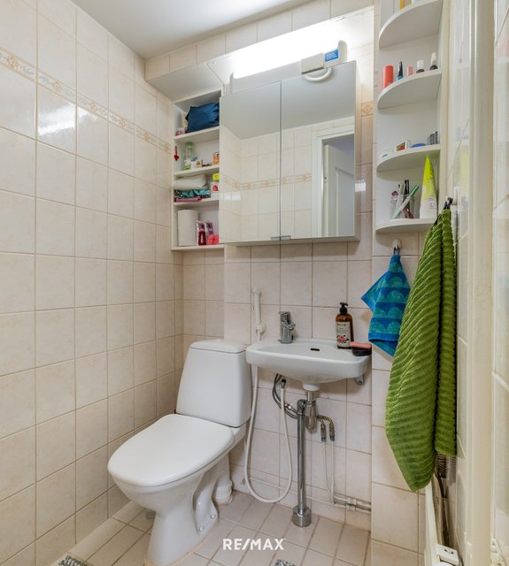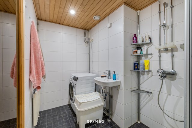 - Suihku, suihkuseinä, pesukoneliitäntä, lattialämmitys, ja pesuallas