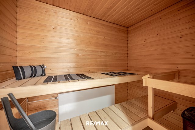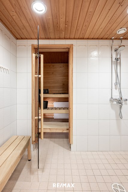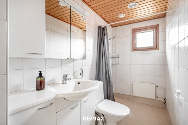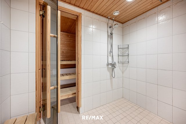 - Yläkerran kylpyhuoneessa on suihku sekä WC, bidee ja pesuallas, allaskaappi sekä peilikaappi. Alakerran kylpyhuoneessa on suihku. Alakerran kylpyhuoneen yhteydessä sijaitsee myös sauna ja kodinhoitohuone, jossa on WC.