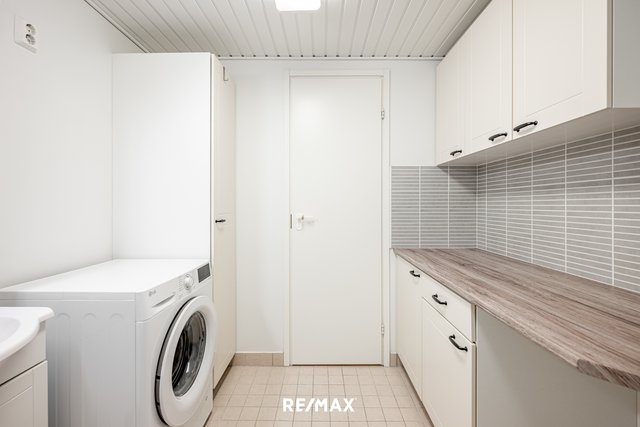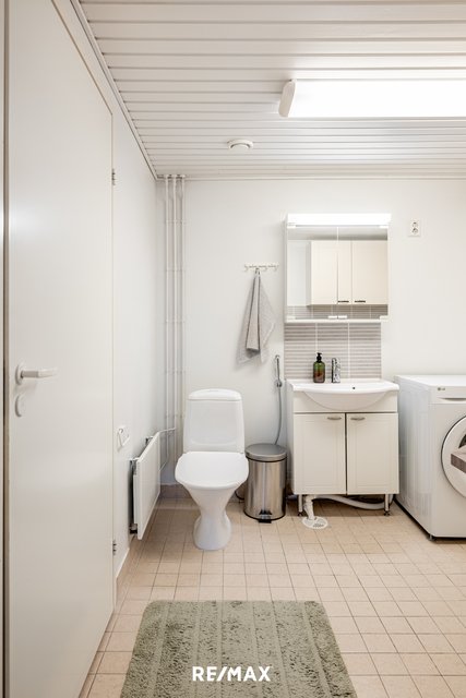 - Pesukoneliitäntä, tila pesutornille, lattiakaivo, lattialämmitys, pesuallas, wc, allaskaappi, peilikaappi, kaappeja, ja pöytätaso