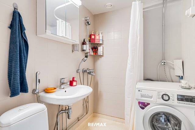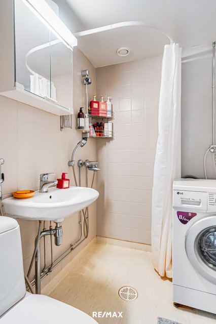 - WC-istuin, suihku, pesukoneliitäntä, peilikaappi, pesuallas, ja bidee-suihku
