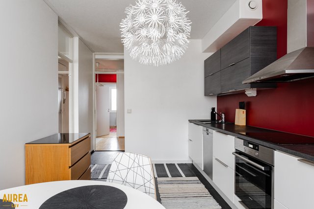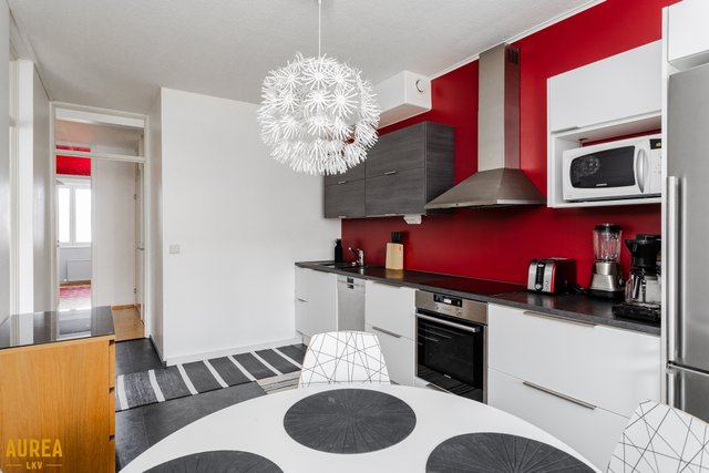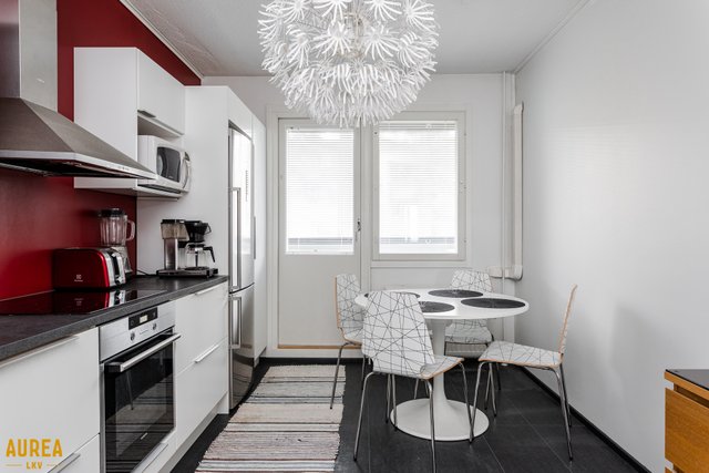 - Remontoitu vuonna 2016. Novart Ala Carte-keittiö. Tasot laminaattia, välitila levy. Keittöstä käynti lasitetulle parvekkelle.