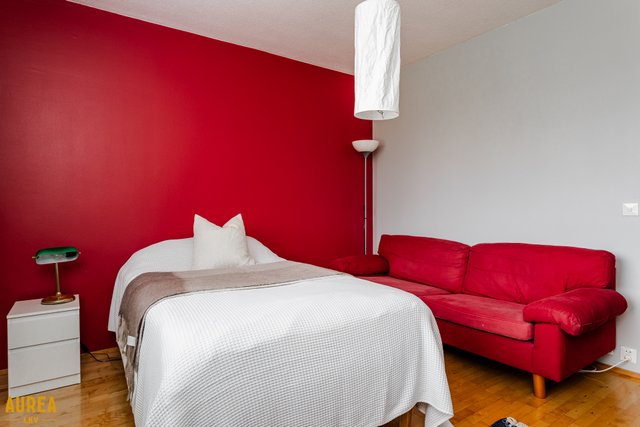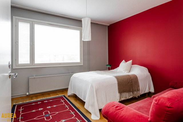 Makuuhuone sijoittuu asunnon rauhalliselle pohjoispuolelle, ja eteisen yhteydessä on erillinen vaatehuone, joka tarjoaa runsaasti säilytystilaa. Tyylikäs kylpyhuone on remontoitu vuonna 2013, ja sen moderni ilme kestää aikaa.