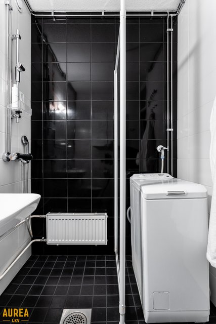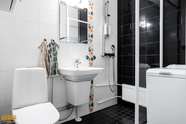 - WC-istuin, suihku, pesuallas, peili, säilytyskaapisto, ja pesukoneliitäntä