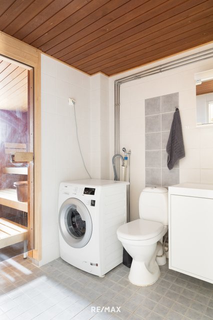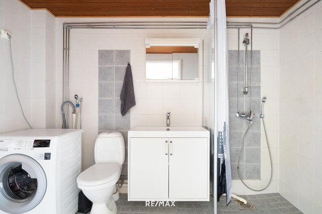 - Tilava, kauttaaltan kaakeloitu kylpyhuone yläkerrassa. Varustuksiin kuuluu suihku, suihkuseinä, allas, allaskaappi, peilikaappi, wc-istuin, pesukoneliitäntä
