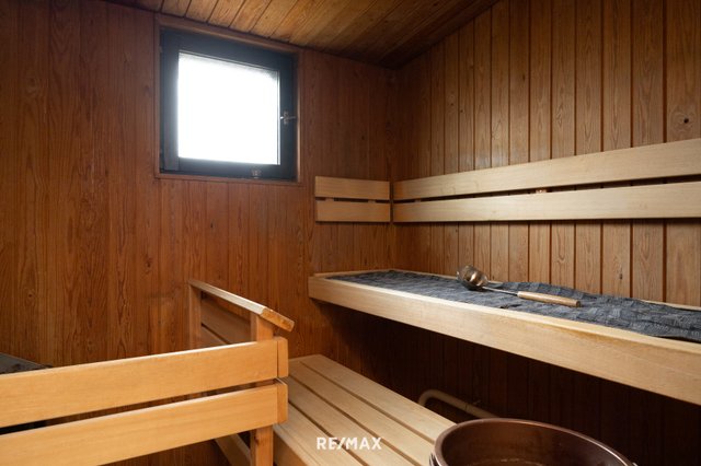 Yläkerrasta löytyvät kaksi makuuhuonetta sekä saunaosasto, mikä tekee kerroksesta ihanteellisen rauhoittumisen ja levon tilan.