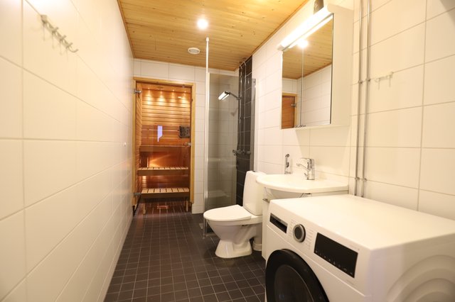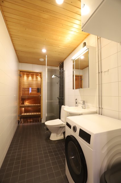 - Suihku, peilikaappi, pesuallas, allaskaappi, wc-istuin, bidee-suihku, pesukoneliitäntä, ja lattialämmitys