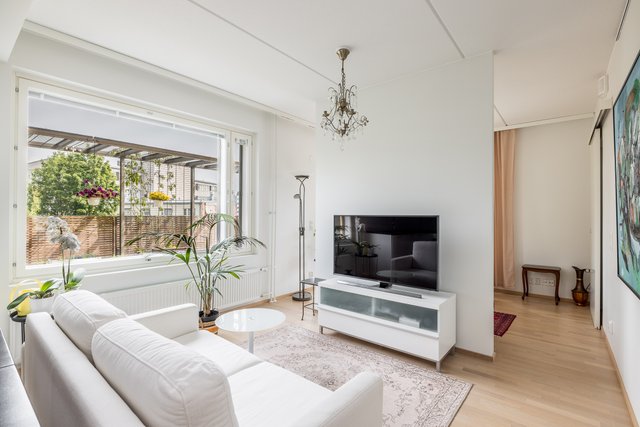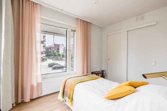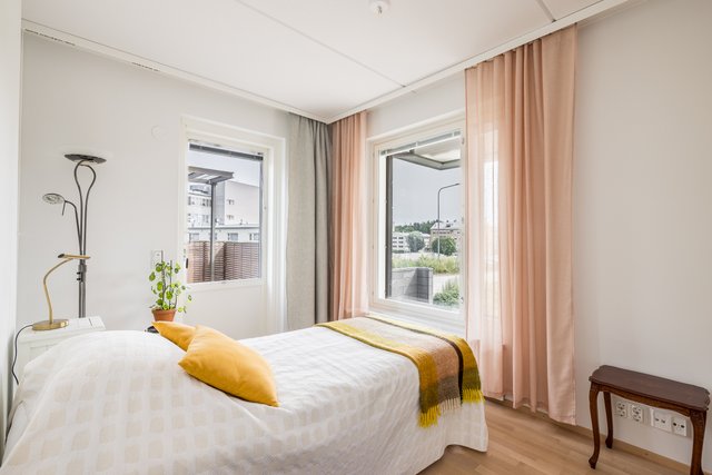 - Makuuhuoneen ikkunat kahteen suuntaan itä/kaakko, kulmahuoneisto. Makuuhuoneesta avautuu suora kulku koko huoneiston levyiselle tilavalle terassipihalle.