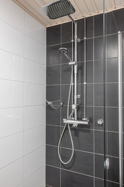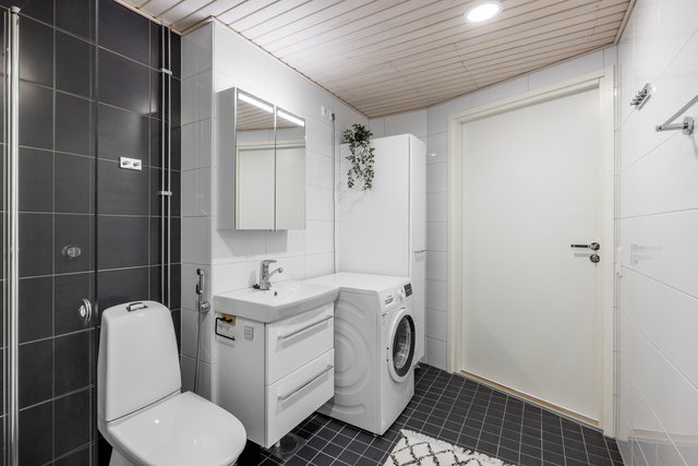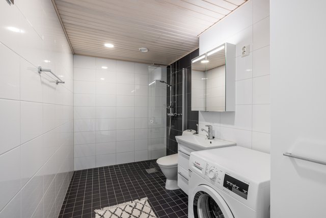 - WC-istuin, suihku (sadesuihku), suihkuseinä, pesukoneliitäntä, lattialämmitys, peilikaappi, allaskaappi, ja pesukone