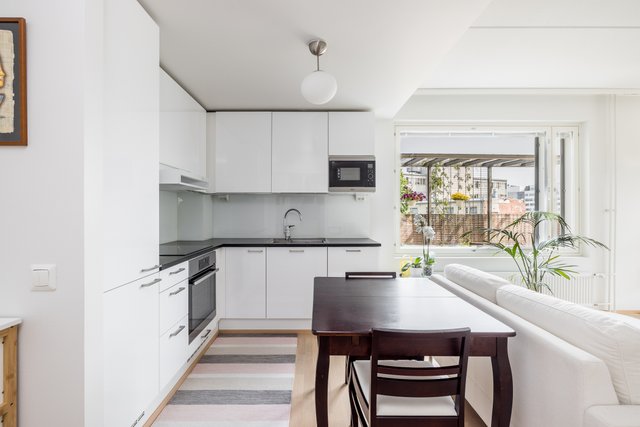 - Valoisa avokeittiö, sopivasti kaappi ja laskutilaa, paikka ruokapöydälle.
