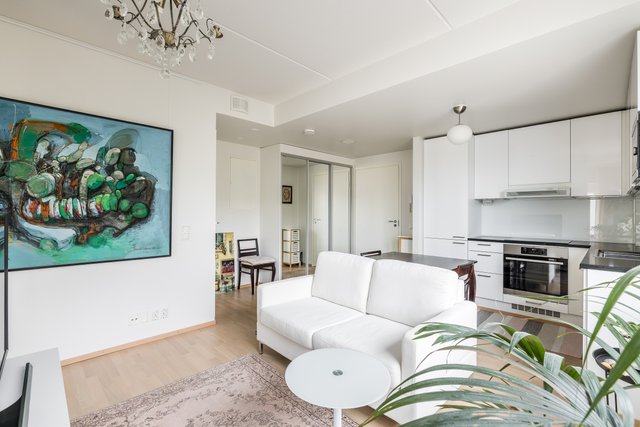 - Avara ja valoisa oleskelutila, jossa olohuone ja keittiö muodostavat yhtenäisen kokonaisuuden.