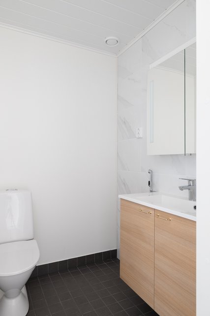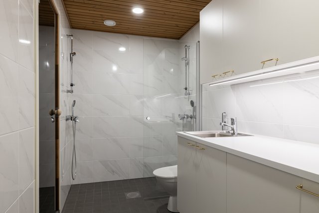 - Suihkuseinä, pesukoneliitäntä, lattialämmitys, allaskaappi, wc-istuin, ja pesuallas