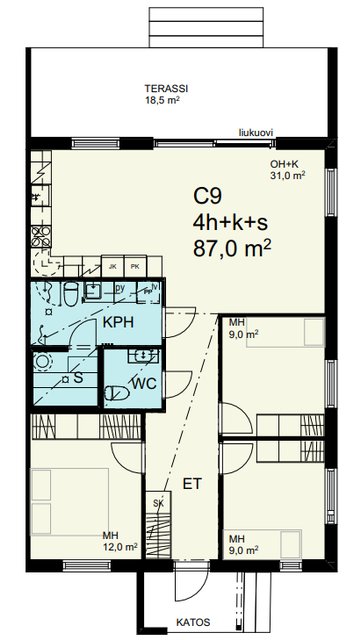 - Eteisen lattiamateriaalina laatta.
