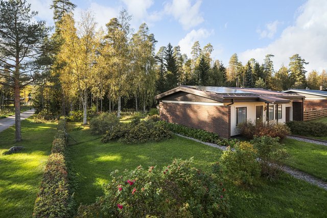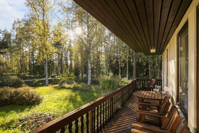 - Tasainen kulmatontti, jolla nurmikkoa ja istutuksia. Takarajalta tontti rajoittuu Patomäen puistoalueeseen. Erittäin suojaisa ja viihtyisä katettu terassi, jonne käynti suoraan saunaosastolta.