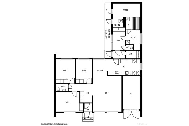 3 mh, oh, rt, kt, takkahuone, saunaosasto, 2 x wc, vh, lämmin tekn.tila ja varasto, autotalli