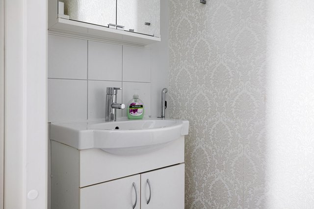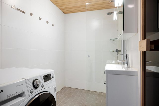- Kylpyhuone sijaitsee huoneiston alakerrassa, saunaosaston yhteydessä. Vaalea, valoisa ja tilava kylpyhuone on kokonaan laatoitettu ja tarjoaa loistavat puitteet saunailtojen lisäksi myös kodin vaatehuollolle. Kylpyhuoneessa on tilat pesutornille tai vaikkapa lisäkaapeille. Kylpyhuoneen varusteina suihku, suihkuseinä, peilikaappi, käsienpesuallas, allaskaappi ja pesukoneliitäntä. Taloyhtiön märkätilojen kuntotutkimuksessa kylpyhuoneen kunnoksi on todettu hyvä.