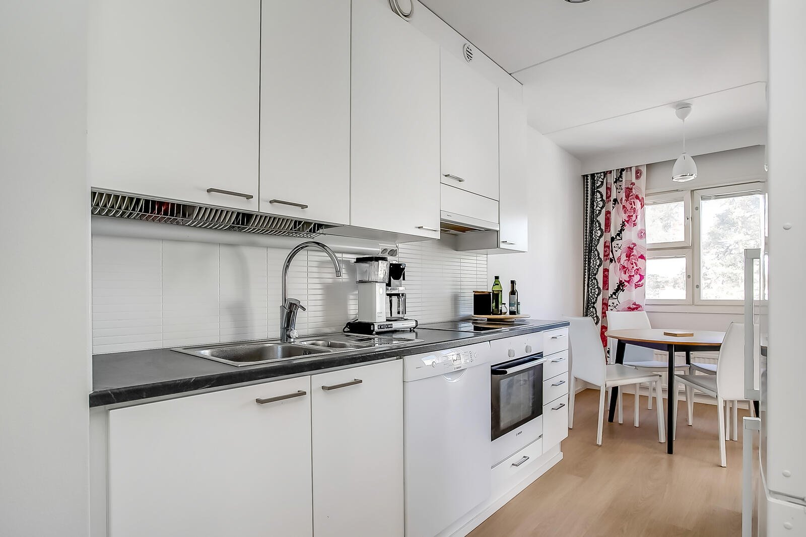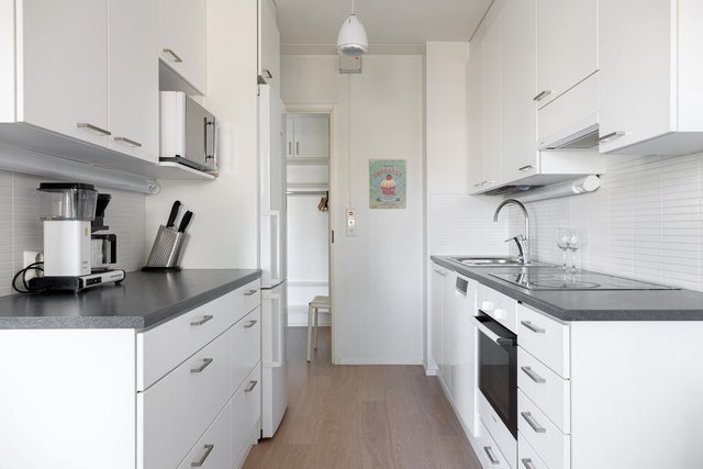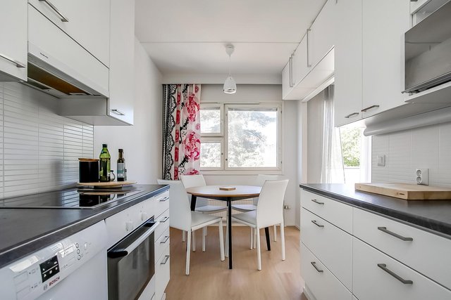- Vaalea klassikkokeittiö, jossa runsaasti säilytystilaa löytyy valkoisista siistikuntoisista kaapistoista ja työskentelytilaa tarjoaa kivikuvioiset työtasot. Kodinkoneet ovat pääosin Boschia, liesituuletin on merkkiä Savo. Varusteina keittiössä on jääkaappipakastin, keraaminen liesitaso, erillisuuni, liesituuletin, astianpesukone sekä 1,5-altainen allastaso. Keittiöön on kivasti suunniteltu kaksi sisäänkäyntiä, jolloin kauppakassien kanssa keittiön pääsee suoraan eteisestä ja arki- tai juhlakäytössä keittiö avautuu mukavasti ruokailutilan kautta olohuoneeseen. Keittiön ikkunan alla on paikka ruokapöydälle. Keittiö on remontoitu loppuvuodesta 2013.