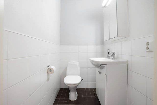 - WC-istuin, suihku, pesukoneliitäntä, lattialämmitys, peilikaappi, ja pesuallas