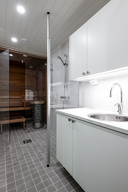 - Lattia: vesieristetty, laatoitettu, vesikiertoinen lattialämmitys Seinät: suojakäsitelty lämpöhaapa 15x90, savuharmaa lasiseinä Katto: suojakäsitelty lämpöhaapa 15x90 Lauteet: istuinosat ja kaide lämpöhaapaa 28x90 Varusteet: sähkökiuas valmistajan mitoitusohjeen mukaan (esim. Harvia Cilindro 6-11 kW, kiukaassa kiinteä ohjaus)