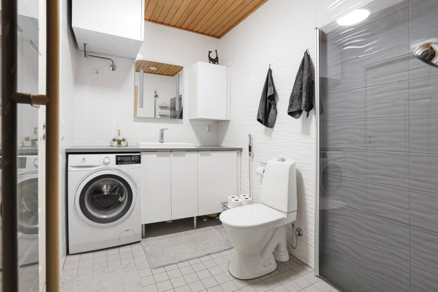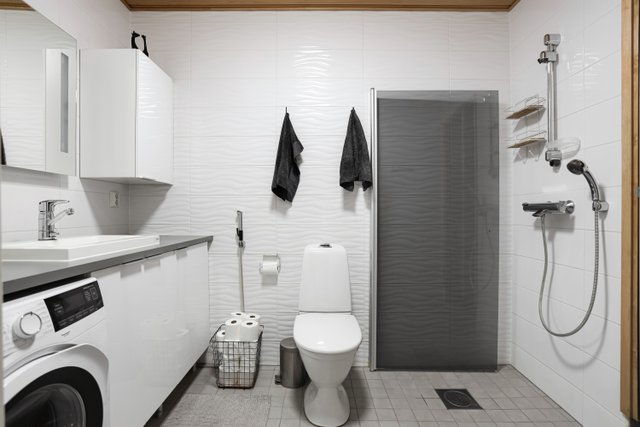- WC-istuin, suihku, peili, pesukoneliitäntä, ja suihkuseinä