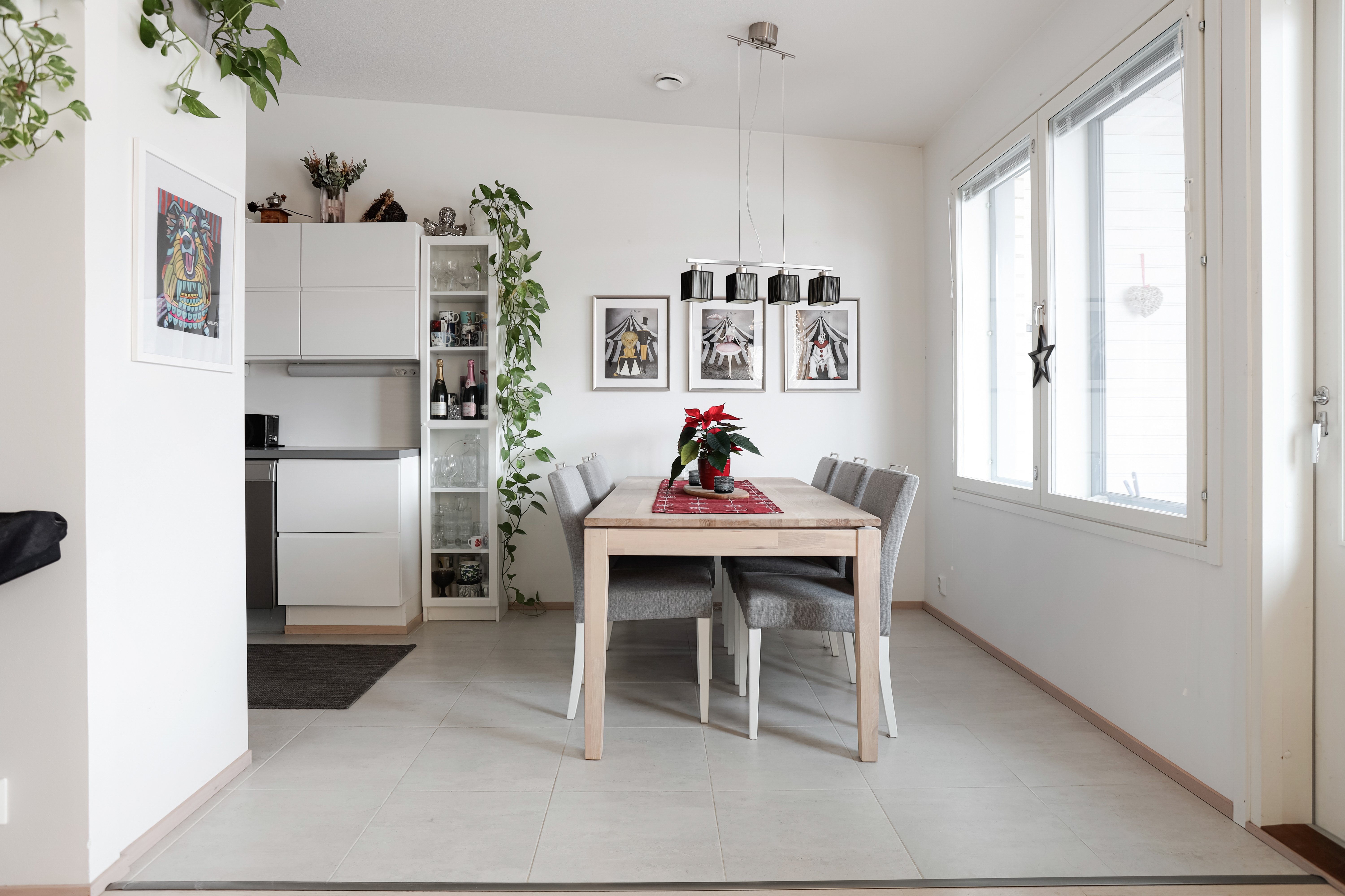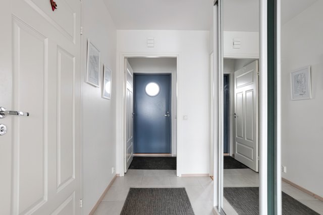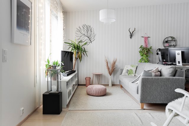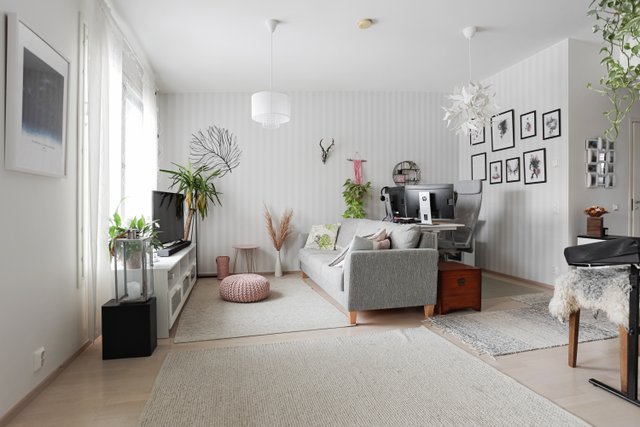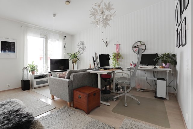 Huoneisto on valoisa ja avaran tuntuinen. Olohuone on nykyisillä omistajilla jaettu työtilaan sekä olohuonekäyttöön.