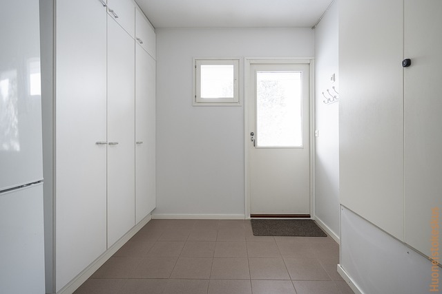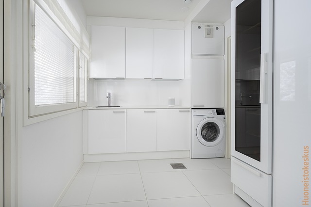 - Lattialämmitys, lattiakaivo, pesukoneliitäntä, pesukone, pöytätaso, pyykkikaapit, ja pesuallas
