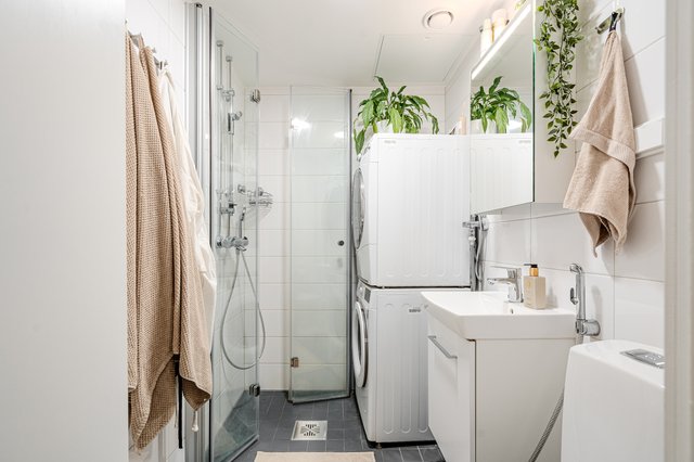 - WC-istuin, suihku, suihkuseinä, pesukoneliitäntä, lattialämmitys, peilikaappi, pesuallas, allaskaappi, ja bidee-suihku