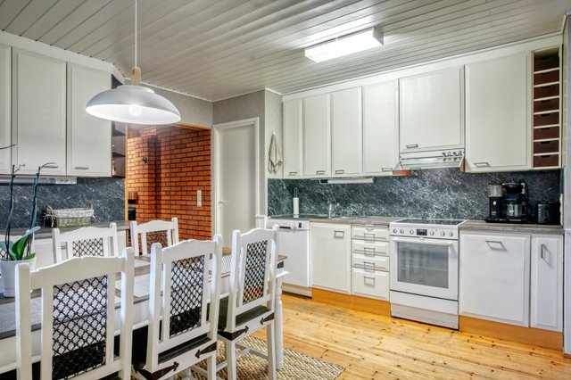- Keittiössä runsaasti kaappitilaa. Keittiökaapistojen ovet ja laatikostot vuodelta 2003, mutta erittäin siistikuntoiset. Lattia mäntylautaa.