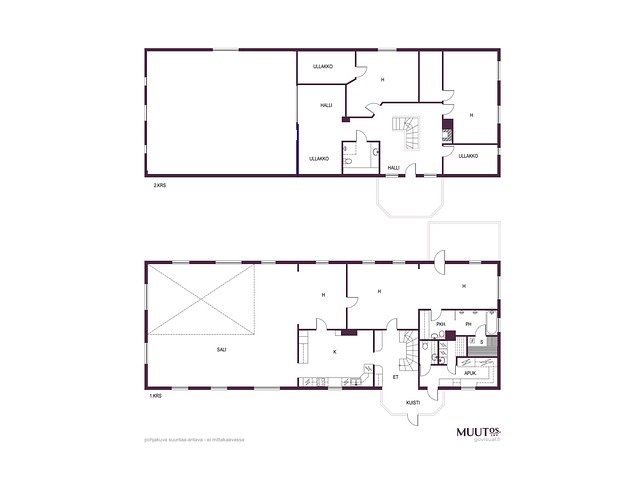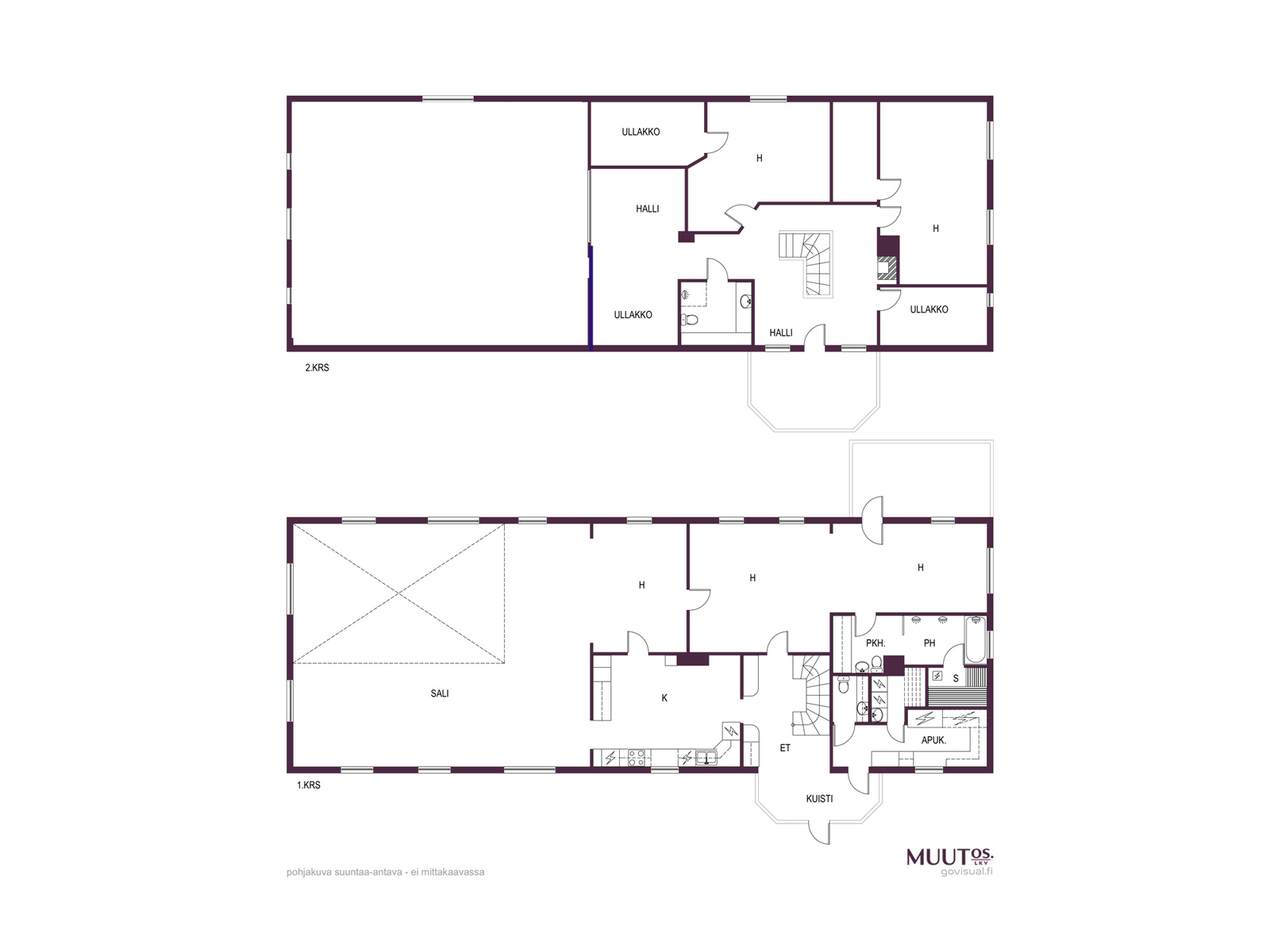 - Pinta-alat perustuvat myyjältä saatuihin tietoihin ja rakennuspiirustuksista laskettuihin arvioihin. Pinta-aloja ei ole tarkistusmitattu, mitattaessa pinta-alat saattavat olla ilmoitettua suurempia tai pienempiä. Hinta ei ole pinta-alaperusteinen. Rakennuspiirustusten mukainen kerrosala 360 m2 ja huoneistoala 326 m2. Asuintilojen pinta-ala on laskettu rakennuspiirustuksista ja siihen on huomioitu kaikki asuinkäytössä olevat tilat.