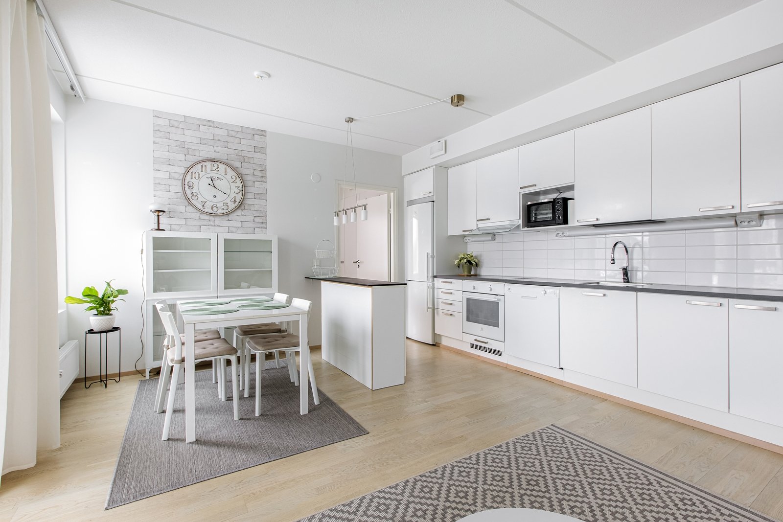 Asunnon 46 neliötä on käytetty tehokkaasti. Olohuone ja keittiö muodostavat avaran kokonaisuuden, jossa on kaunis parkettilattia. Keittiöstä löytyy kaikki tarvittavat laitteet, kuten astianpesukone ja induktioliesi. Makuuhuoneessa on myös parkettilattia ja maalatut seinät, jotka luovat rauhallisen tunnelman. Kylpyhuone on moderni ja varustettu lattialämmityksellä sekä pesukoneliitännällä.