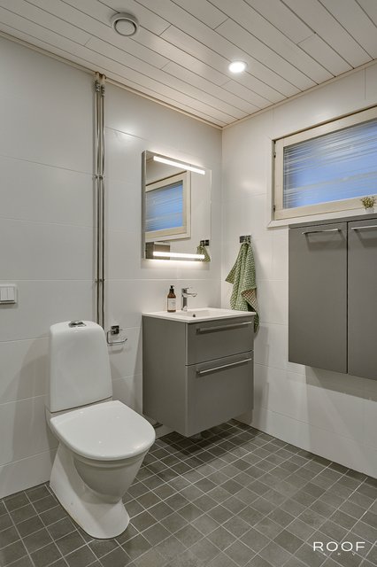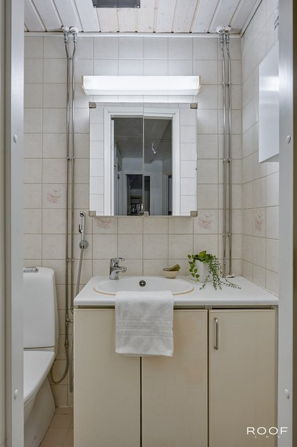 - WC-istuin, suihku, suihkuseinä, pesukoneliitäntä, lattialämmitys (sähkö), peili, ja allaskaappi