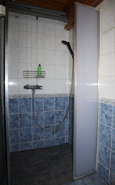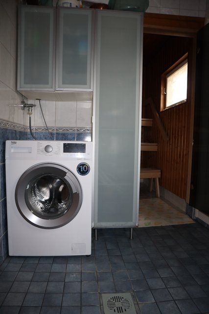 - Laatoitettu pesuhuone, remontoitu 2003 ja asennettu vesieristys. Pesukoneliitäntä. Kylpyhuoneesta suoraan käynti takapihan terassille.