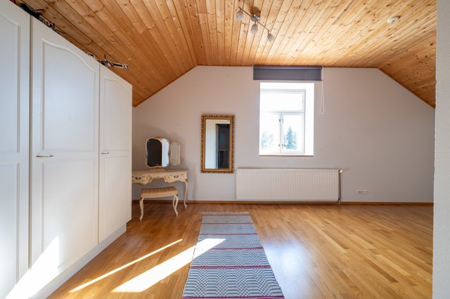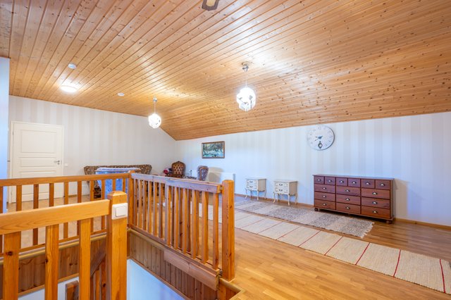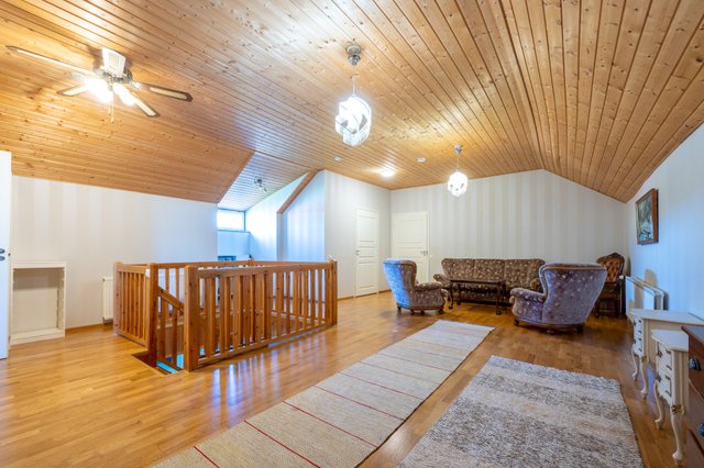 Neljän makuuhuoneen lisäksi talossa on reilunkokoinen eteistila, aulatilat ja olohuone, jonka jatkeena on erillinen ruokatila/ kirjastohuone, joka soveltuu monenlaiseen käyttöön ja on helposti muunneltavissa, vaikka lisämakuuhuoneeksi. Tilavaan keittiöön mahtuu reilunkokoinen ruokapöytä, jossa on nykypäiväset kodinkoneet ja paljon kaappi- sekä laskutilaa. Kirsikkana kakun päälle siellä on myös reilunkokoinen Festivon kylmiö ja vanhan ajan erillinen leivinuuni valurautahellalla. Keskikerroksessa on talon toinen kylpyhuone ja wc, myös yläkerrassa wc. Kellarikerroksessa on kylpyhuone ja saunaosaston jatkeena on kelohirrestä vuorattu viihde-/ takkahuone, johon pääset vilvoittelemaan löylyjen jälkeen.