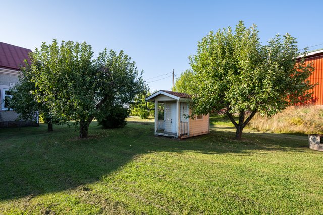 Pihapiiri on vehreä ja siellä on leikkimökki ja navetan jatkeena on autokatos. Erillisessä saunarakennuksessa on tupa- löyly- ja pesuhuone. Vanhan ajan puusaunan patina tarjoaa menneiden aikojen tunnelmaa, jossa arjen kiireet unohtuvat.