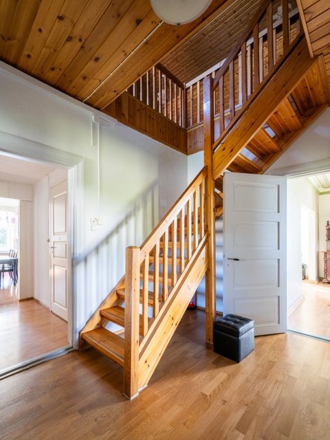 Yläkerta (1996 jälkeen), päivitetty 2010 uudelleen, eristeet välipohjan yläpinta + pinnat ja wc +lämmitysputket, ikkunat uusittu 1995 / 2010 aulan ikkuna.